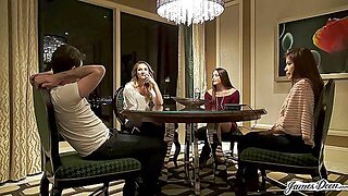 Two busty babes with trimmed pussies get fucked hard by lucky guy until they squirt all over him....